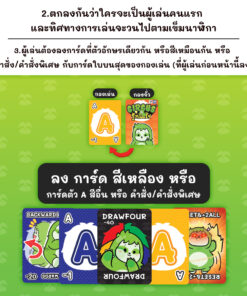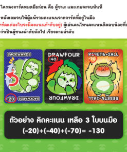 - สลับกันลงการ์ดต่อสีเหมือนหรืออักษรเหมือน หรือท้าทายผู้เล่นคนถัดไป โดยการลงการ์ดคำสั่งหรือการ์ดพิเศษ เป้าหมายคือทำให้การ์ดในมือหมดก่อนเป็น คนแรก คนที่เหลือจะโดนติดลบจากแต้มบนการ์ดที่เหลือในมือของตัวเอง ระวัง! อย่าละสายตา…เพราะโอกาสในการชิงลงการ์ดแทรกตาเล่นของคนอื่นมีอยู่ทุกวินาที